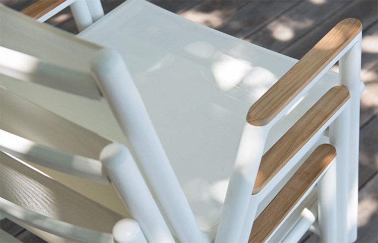 Die Kombination aus Aluminium, Batyline-Canvas® und Teakholz verleiht diesem Stuhl einen ultramodernen und raffinierten Look.
