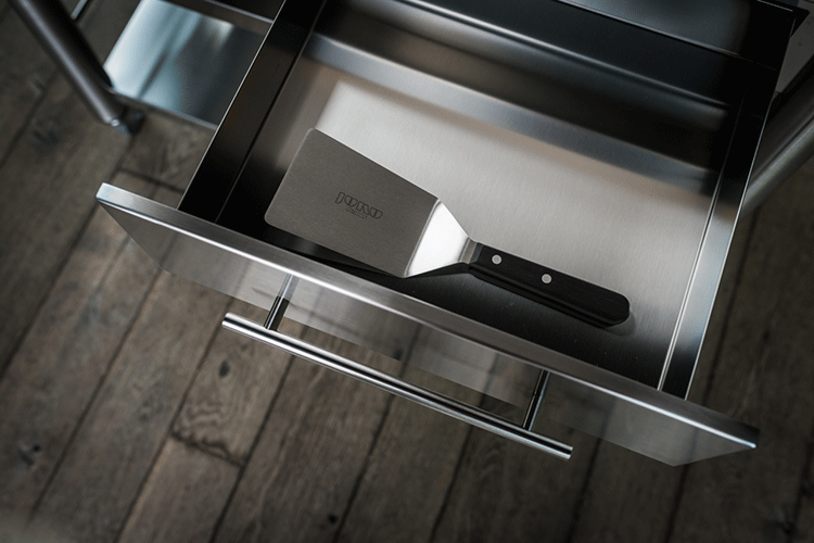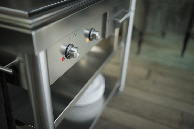 Trolley besteht aus einem Teppan Yaki, 2 Ablagen und einem Speicherfach