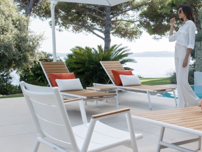 Lounge-Sessel für den AußenbereichGestell aus weiß lackiertem Aluminiumrohr und weiß lackierte Aluminiumlamellen - Armlehnen aus Teakholz natur (nicht geölt)