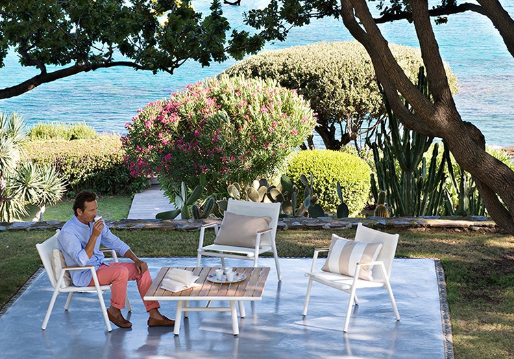 Die Kombination aus Aluminium, Batyline-Canvas® und Teakholz verleiht diesem Stuhl einen ultramodernen und raffinierten Look. Ideal, um einen komfortablen und eleganten Loungebereich am Pool, auf einer Terrasse oder in einem Garten zu schaffen.