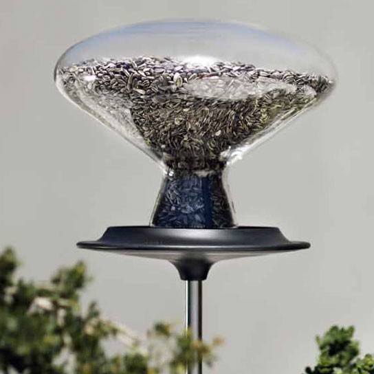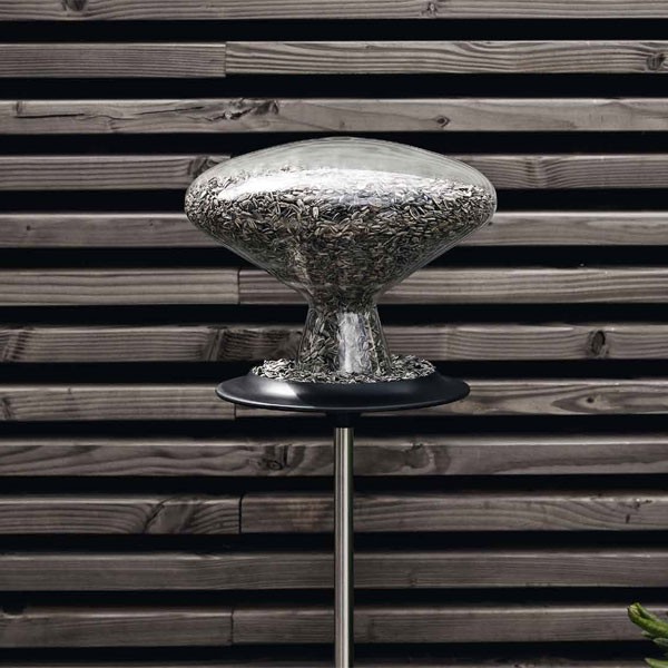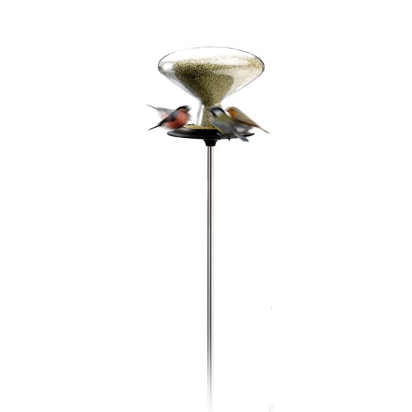 Kleine Vögel in Ihrem Garten gewidmet, besteht diese Zuführung aus einem Glaszylinder, welche die Samen und ein Fuß Edelstahl Pflanzen direkt auf dem Boden.