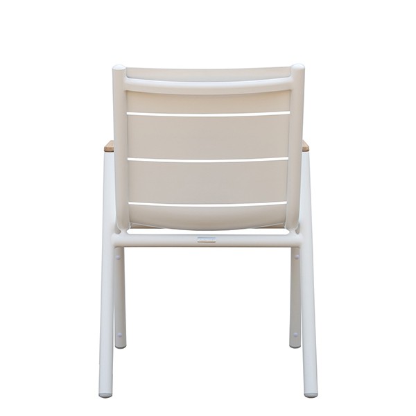 Esszimmerstuhl für den AußenbereichGestell aus weiß lackiertem Aluminiumrohr und weiß lackierte Aluminiumlamellen - Armlehnen aus Teakholz natur (nicht geölt)