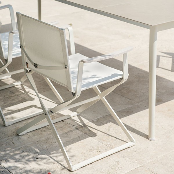 Der Vorsitzende Direktor Ciak aus der EWU ist ein Klappstuhl hergestellt aus extrudiertem Aluminium lackiert mit Edelstahl-Elementen, verbunden mit einem technischen Gewebe geeignet für den Einsatz im Außenbereich und Armlehnen in Buche lackiert Ton in Ton mit den vier verschiedenen Farben angeboten. Diese Elemente Aluminium Spirale-Konstruktion bietet eine Seite Design und Modern, sehr leicht in verschiedenen äußeren Welten, von der Terrasse des Café in den kleinen Räumen Typ Balkone zu integrieren. Es kann durch die Fußteil-Ciakergänzt werden.