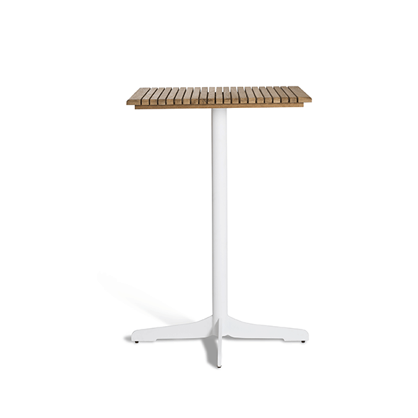 Stehtisch quadratischen Sockel aus Aluminium, die durch die Verarbeitung von Epoxidharz, zwei Farben, anthrazit oder weiß lackiert.Drei Ausführungen erhältlich für Kettenblätter: Aluminium gemalt von Epoxy, HPL oder Teak Behandlung.